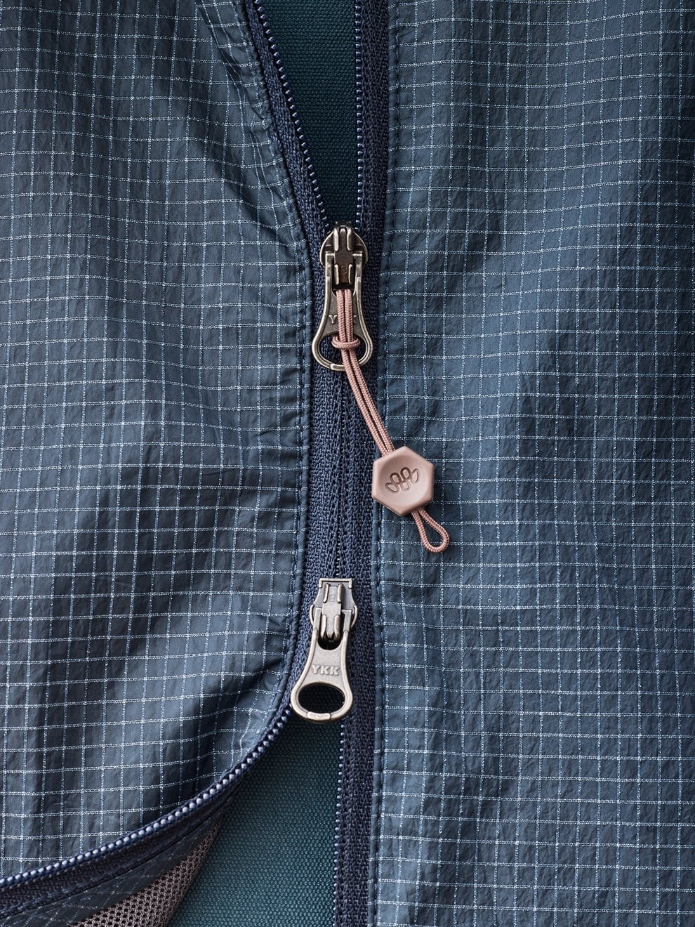 秋冬のマウンテンランニングを想定した新作のウィンドシェルです。メインの素材は、通気性とストレッチ性が高く、汗をかいたときも肌離れが良いソフトシェル。冷たい風を受けて生地が肌に触れたときも冷気が伝わりにくい一方で、通気性があるためオーバーヒートもしにくくなっています。肩から前身頃と背中のウェスト部分には、防風性と耐久性に優れるHPPE(ハイパフォーマンスポリエチレン)のリップストップ生地を使用。AERO JACKETと同様、両サイドにベンチレーション兼用の大型ポケット、右手首に小銭や鍵などを入れられるジッパー付きのポケット、左手首にはウォッチウィンドウを備えています。マウンテンランニングだけでなく秋冬の幅広いシチュエーションで重宝するウィンドシェルです。